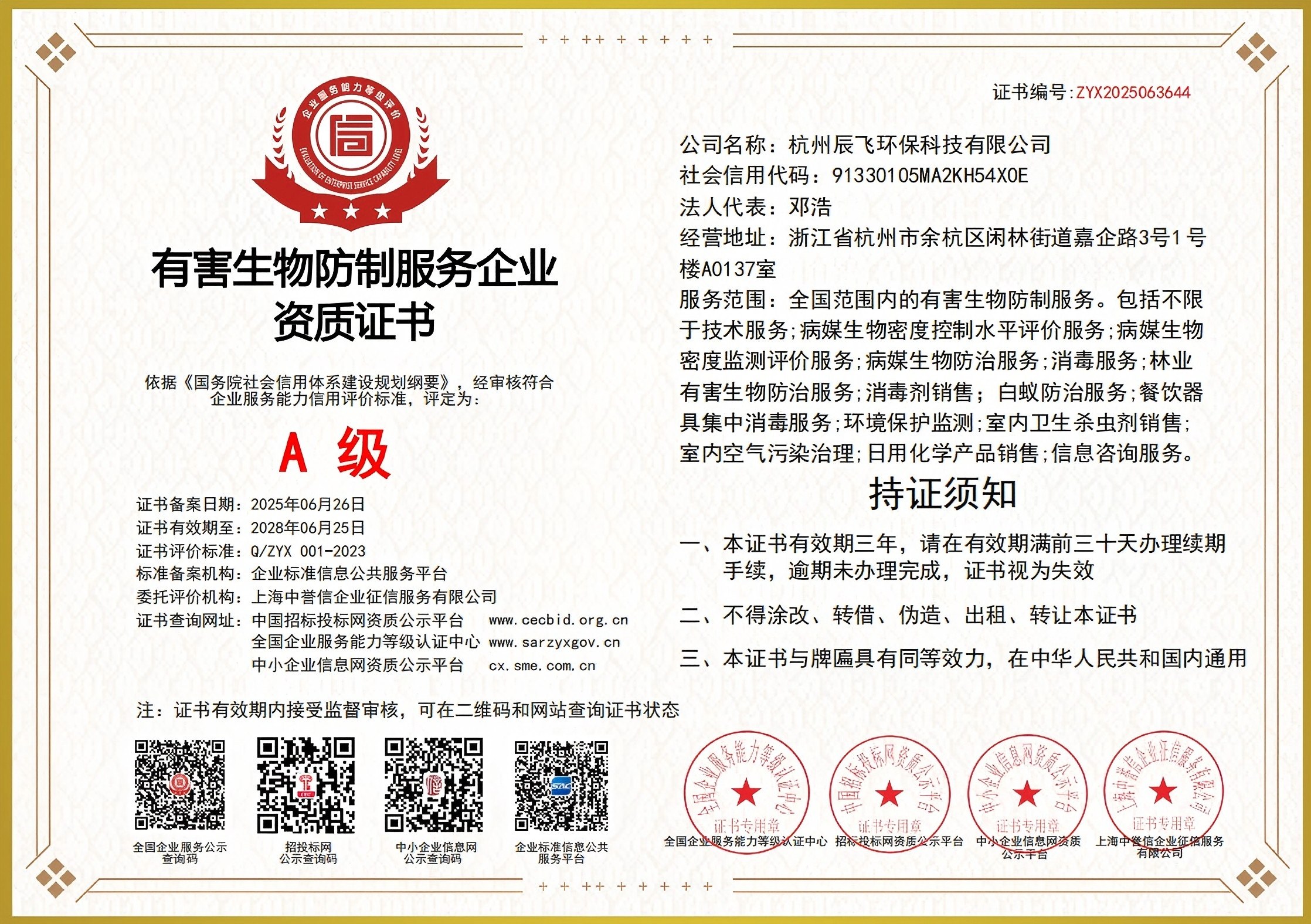 杭州辰飛環(huán)保科技有限公司是一家專業(yè)的PCO有害生物防治服務機構(gòu)。是經(jīng)杭州市工商局注冊登記、杭州市白蟻防治管理所、PCO協(xié)會批準的城市害蟲綜合治理消殺公司,是集除四害、白蟻消殺、除蟲、消毒殺菌、室內(nèi)空氣污染治理、藥械銷售于一體的大型專業(yè)杭州有害生物防治科技有限公司。主要從事新建、擴建、改建、裝飾裝修單位建筑物的白蟻防治和白蟻預防工程,同時從事工廠、酒店、企事業(yè)單位、住宅小區(qū)和家庭的”四害”消殺和白蟻防治服務,長期向各類型客戶提供杭州白蟻消殺、除蟑螂、除老鼠、除蟲、消毒殺菌等優(yōu)質(zhì)服務。 本公司自成立以來,秉承“誠信、敬業(yè)、高效、務實”的發(fā)展原則,以現(xiàn)...